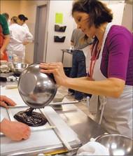 Others practiced “panning” chocolate treats. Panning is the method used for making confections such as chocolate-covered peanuts. The center — a nut, a coffee bean or whatever is to be coated — is placed in a rotating drum. Tempered chocolate is added and the center rolls in the chocolate, gradually building up a chocolate coating. Art and Wilma Wills of Chocolate F/X commandeered the panner, patiently showing how they make confections such as chocolate “gemstones” and chocolate-covered dried Michigan cherries.